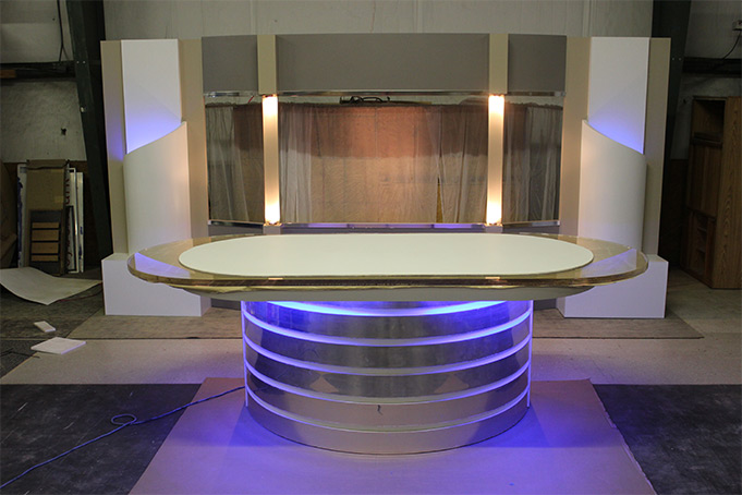 The design and fabrication of one-of-a-kind sets for Visual Media has changed over the years. From stage shows with Gothic Rock Bands for MTV videos, to panel discussions designed for on-line audiences. Hand carved stage props, pyrotechnics, dry ice and backdrops of destroyed cities have given way to LED lighted Chrome desks with 800lb. Acrylic tops. Lighting has changed from Incandescent and Fluorescents to LED and Laser. All these new options open up a World where one can combine New World Technology with Old School knowledge and experience.